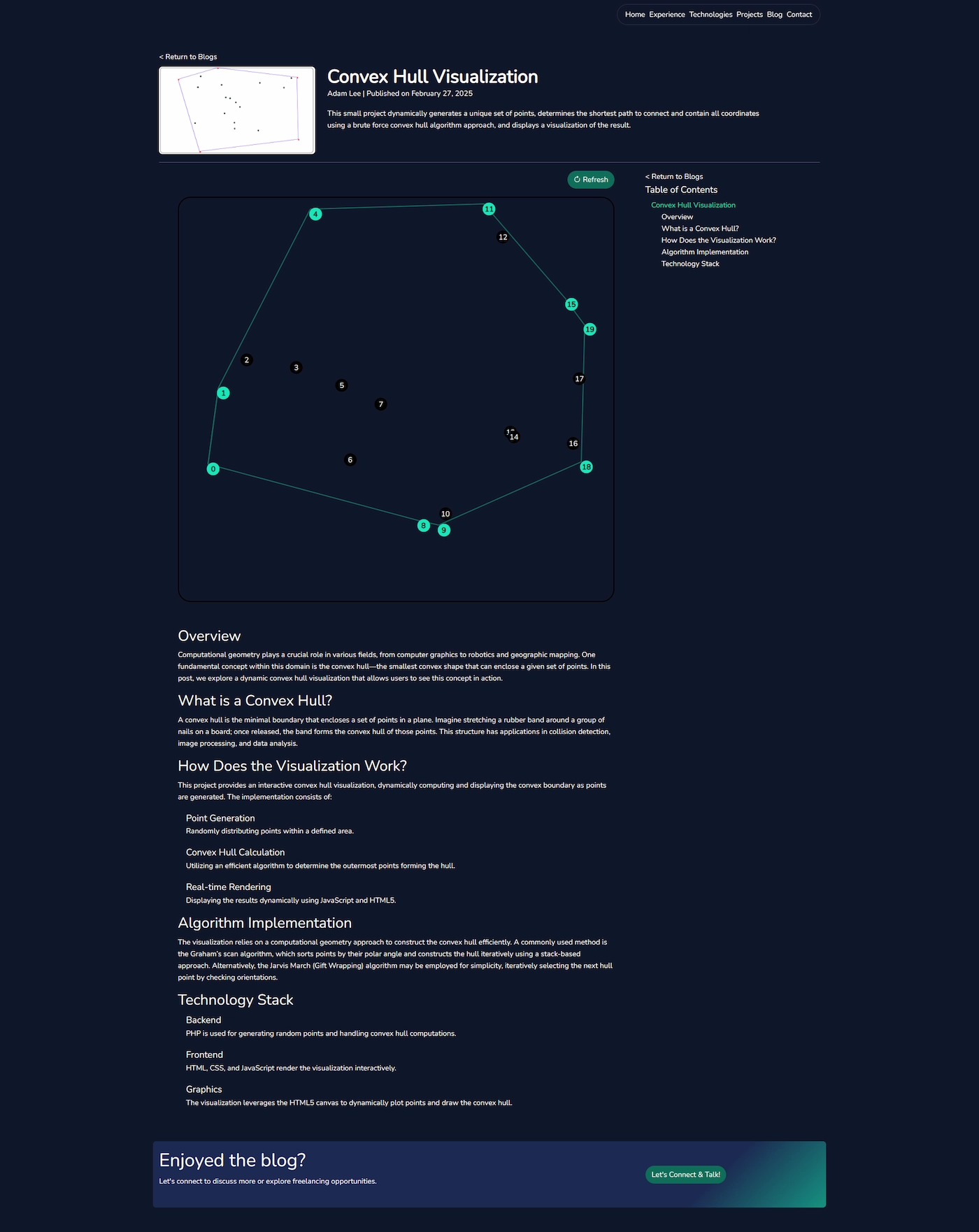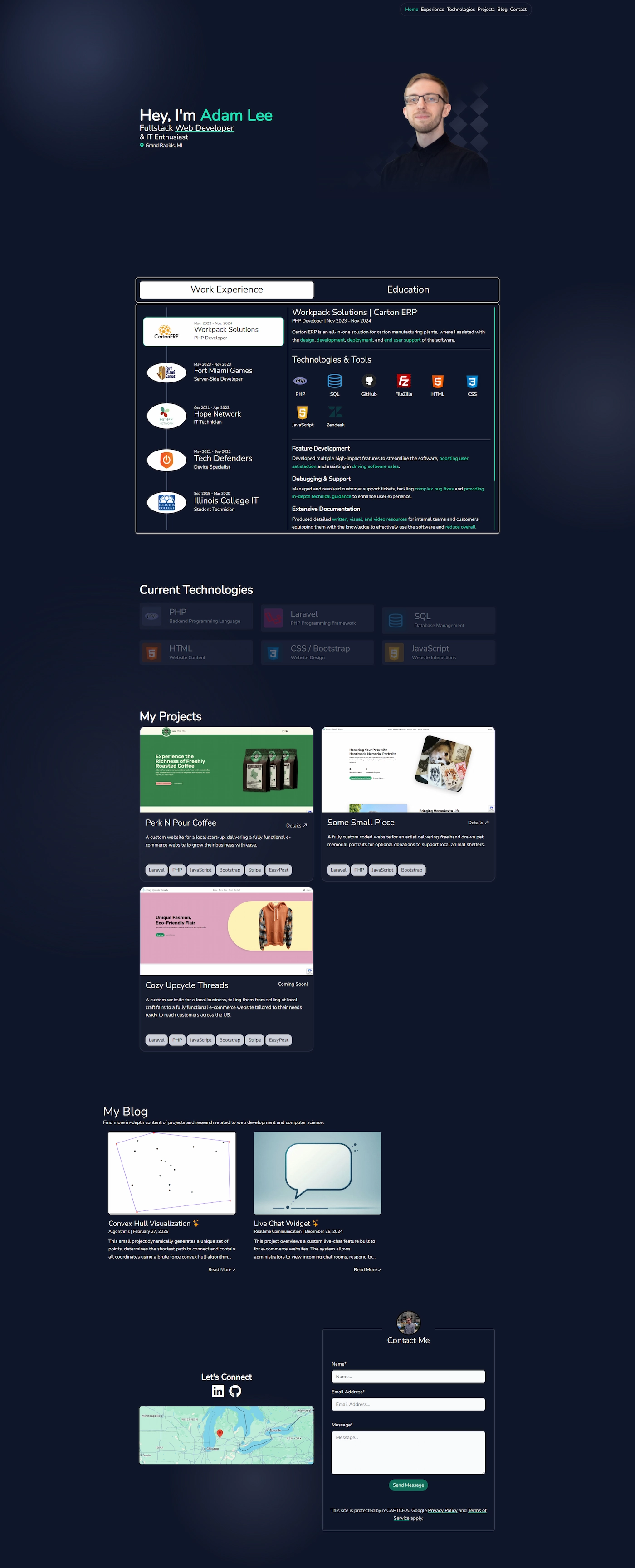 This project showcases a sleek, modern landing page designed to highlight the technical expertise of our in-house developer, Adam. A key principle of effective web design is ensuring that users immediately understand the website’s purpose. To achieve this, we employ concise, impactful text that emphasizes Adam’s name, technical specializations, and location—critical information for potential hiring managers and clients. This information is complemented by a welcoming visual to add a personal touch and a subtle, non-disruptive animation of diagonally placed squares that add depth to the design. Important text elements are highlighted for effortless scanning, ensuring key information is quickly accessible. As a single-page website, there are no call-to-action buttons; instead, users are invited to scroll through a seamless, engaging narrative of Adam’s experience and education.