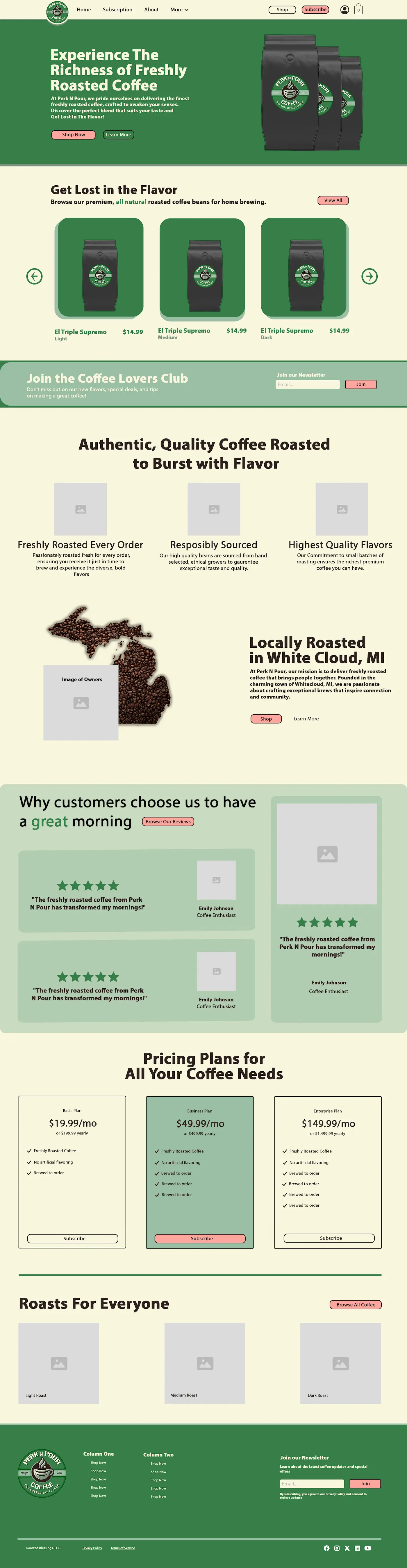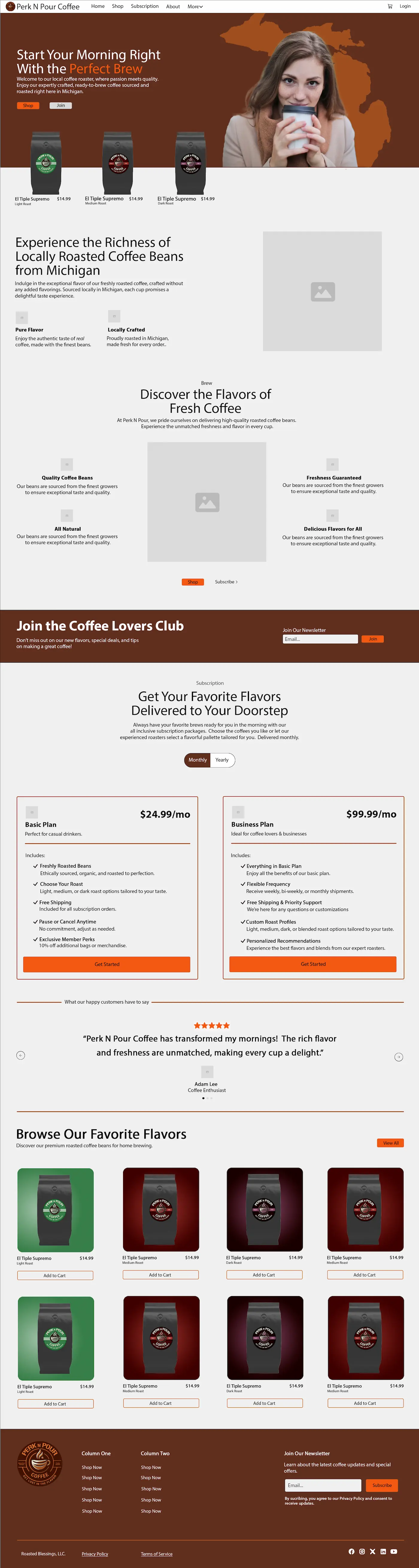 Perk N Pour settled on branding with a vibrant and inviting color scheme that reflects the warmth and energy that their handcrafted coffee delivers year round. The carefully selected tones help enhance the user experience, making the website feel engaging and memorable for visitors.