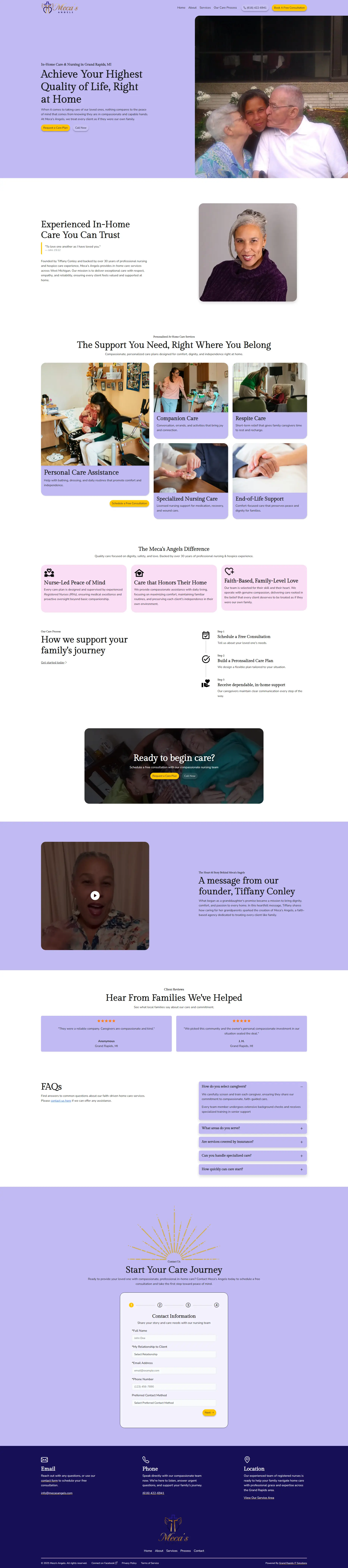 We utilized the company’s existing brand identity, creating a calm and professional experience with a base of white and varying purples, softened by light pink accents. The powerful gold brand color was strategically reserved for critical elements, such as the primary Call-to-Action (CTA) buttons, to ensure maximum visibility and conversion focus while tying directly back to the MECAS Angels brand. This palette reinforces the serious, yet compassionate, nature of in-home nursing care.