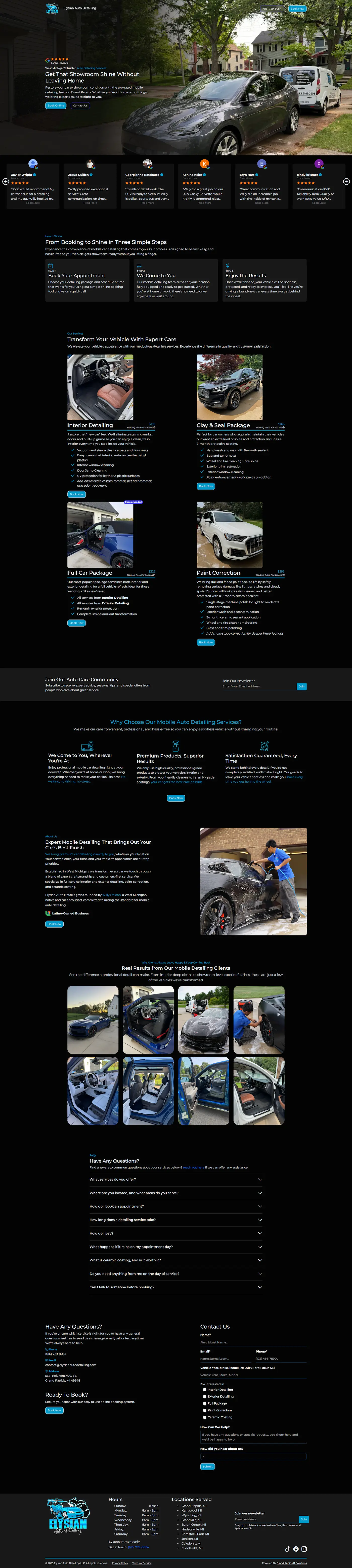 This website design was engineered to match the meticulous, high-end care provided by the mobile detailing service. The site’s clean, modern aesthetic and professional color scheme were chosen to reinforce the quality of the work and establish Digital Authority in the market. This intentional design, coupled with high-resolution imagery of flawless vehicle finishes, ensures the brand is perceived as the local market leader. By clearly communicating the premium nature of the service, we set the stage for clients to confidently invest in Elysian's expertise.